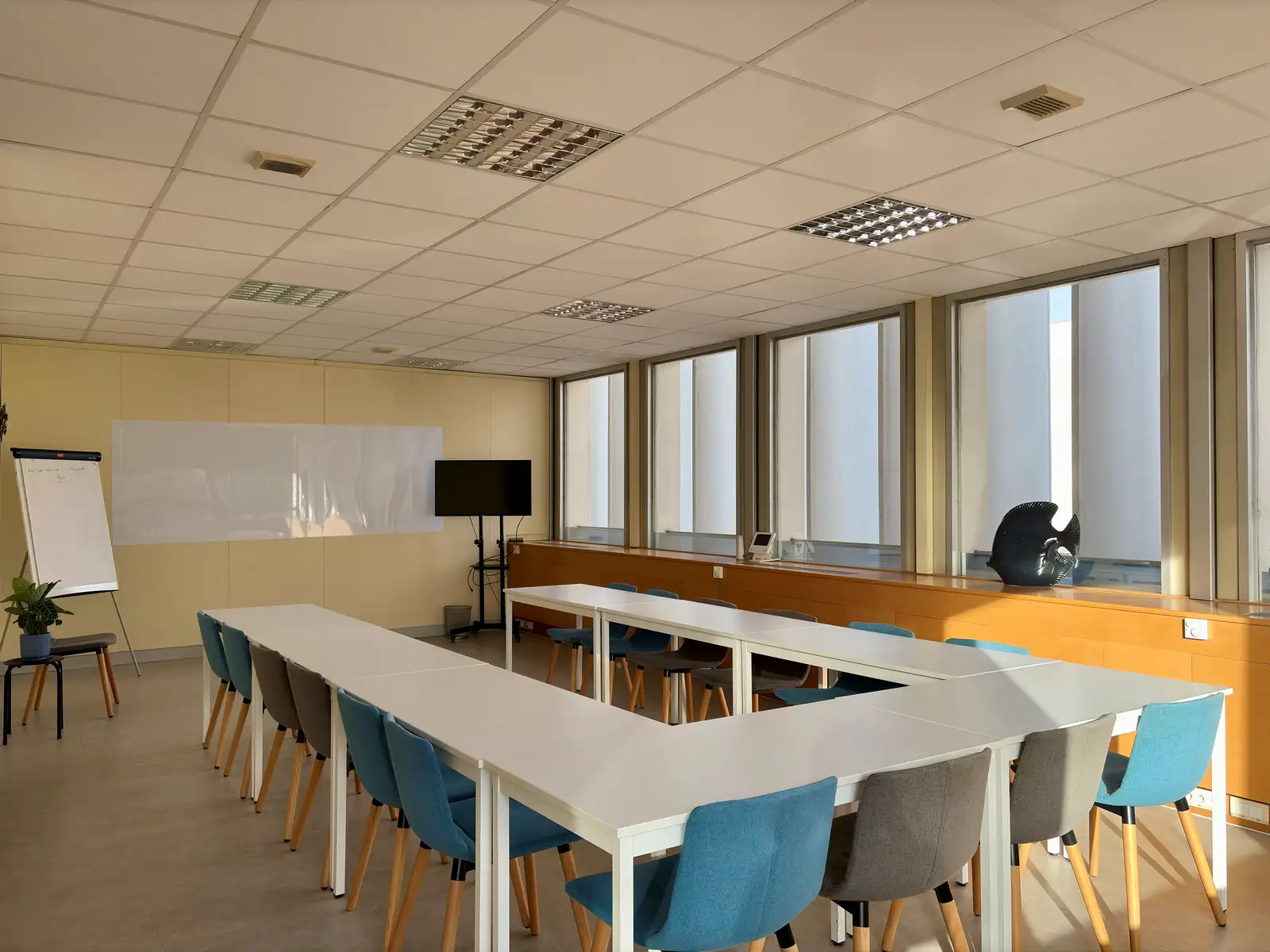 La salle est parfaitement équipée avec un vidéoprojecteur, paperboard numérique, tableau blanc et la wifi pro. Thé et café vous sont offerts et sont à disposition dans la salle.